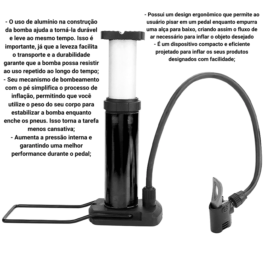 Seu mecanismo de bombeamento com o pé simplifica o processo de inflação, permitindo que você utilize o peso do seu corpo para estabilizar a bomba enquanto enche os pneus. Isso torna a tarefa menos cansativa;