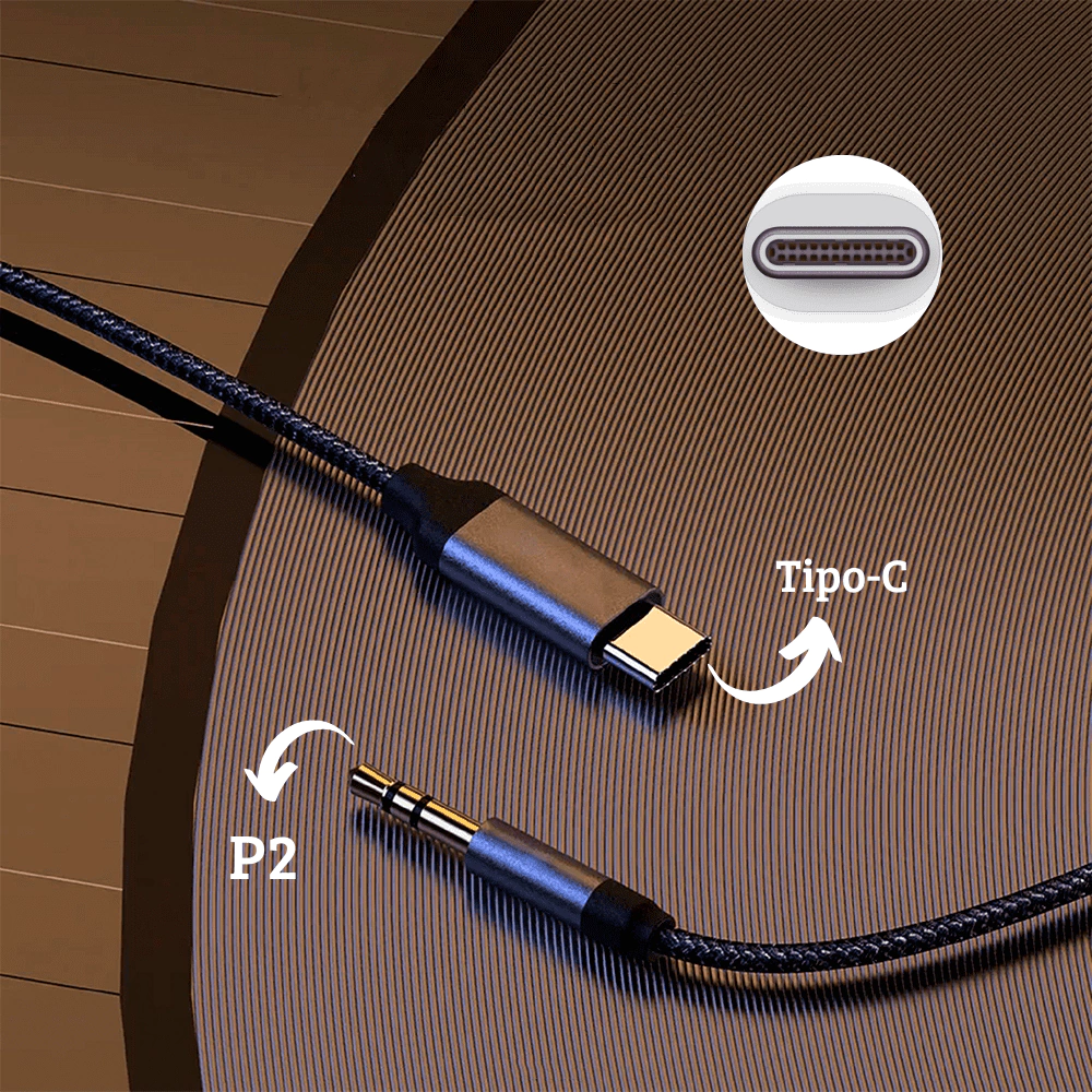 Este é um cabo de áudio auxiliar Tipo-C Para P2 3,5 mm.
