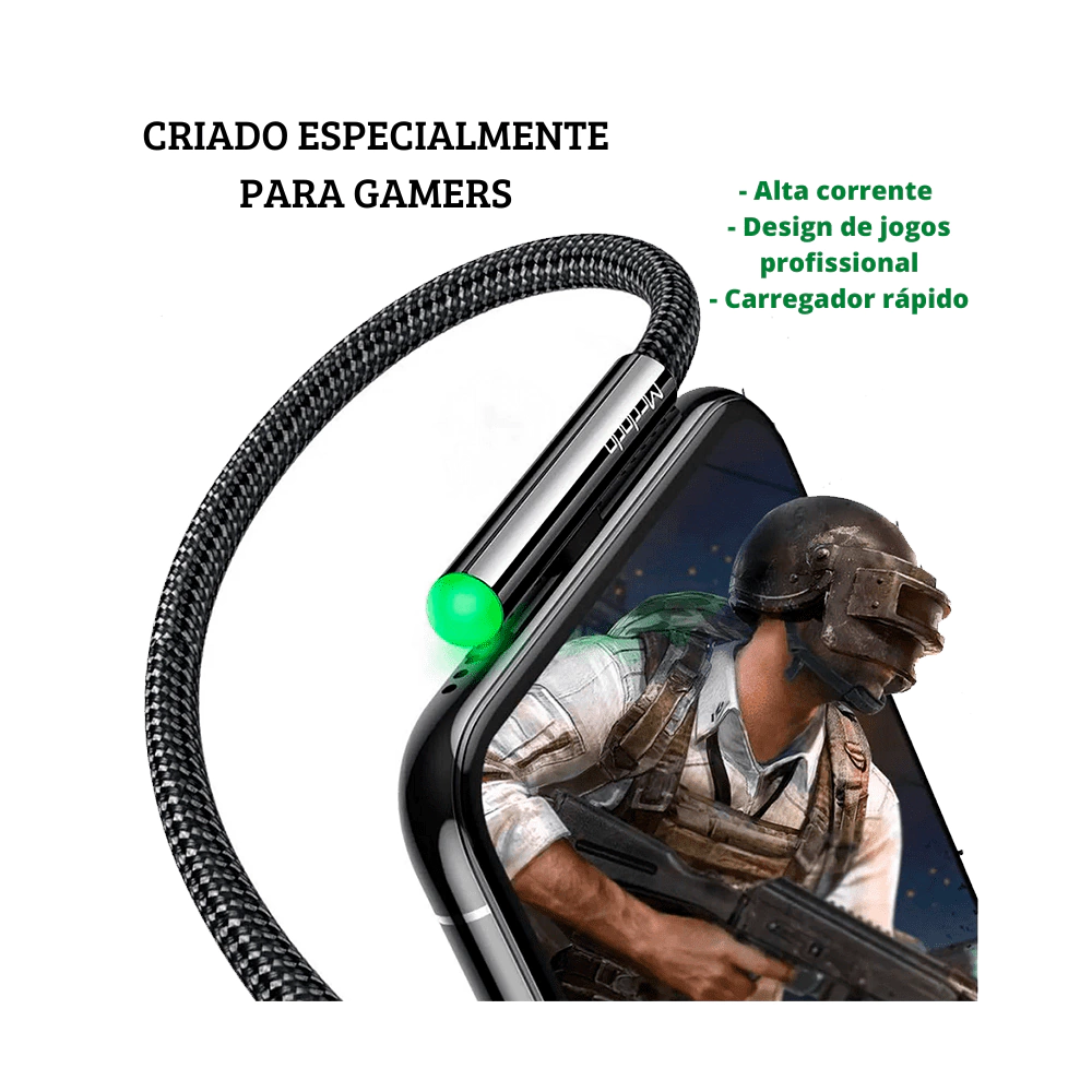 É um cabo criado especificamente para jogadores. O cabo foi projetado para proporcionar o maior conforto de carregamento possível ao usar o telefone, as pontas em um ângulo de 90° são ideais ao usar o telefone horizontalmente permitindo que você se concentre completamente no jogo ou filme que você está assistindo.
