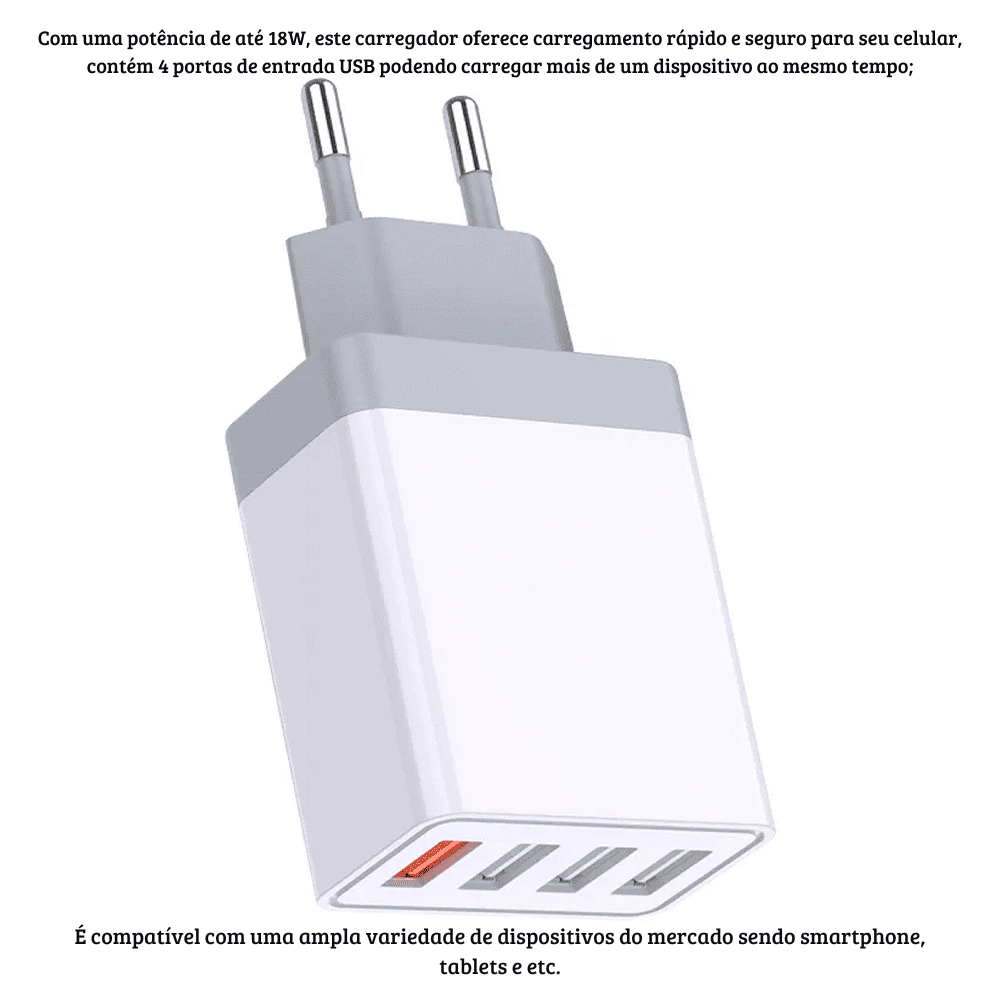 Com uma potência de até 18W, este carregador oferece carregamento rápido e seguro para seu celular, contém 4 portas de entrada USB podendo carregar mais de um dispositivo ao mesmo tempo;