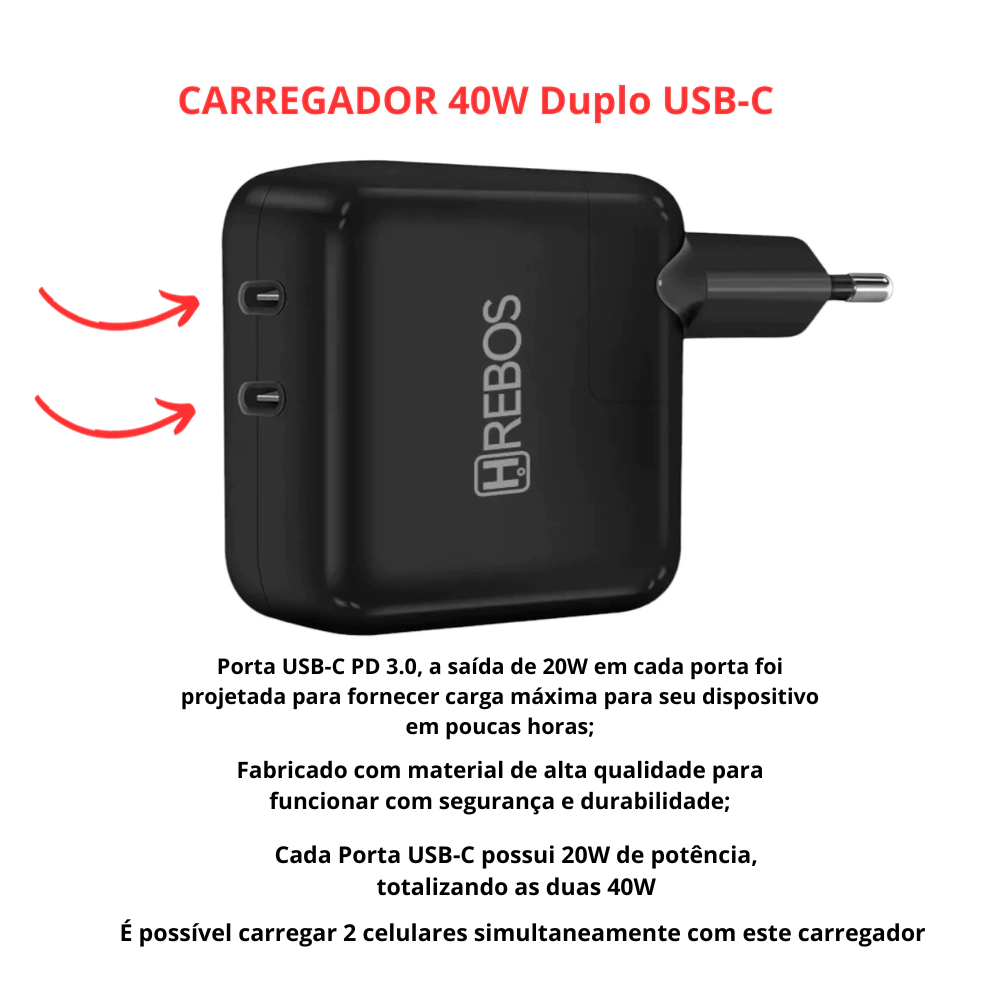 - 01 Fonte 40W Turbo Hrebos Turbo Duplo USB-C (Não acompanha cabo)