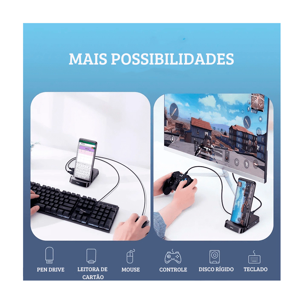 • A base também funciona em outros modelos de diversas marcas, como o motorola Hyper X, mas sem o modo dex uma vez que tal aparelho não tem este modo. Você ainda pode conectar o cabo hdmi para rebater o que vê no celular na tv ou monito.