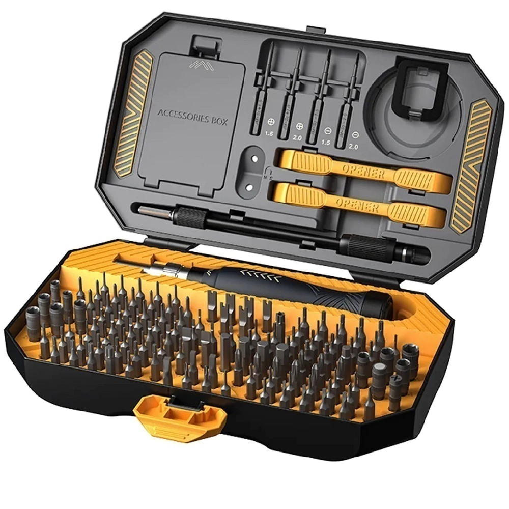 Jogo de Chaves de Precisão 145 em 1 aço reforçado. Este kit de ferramentas possui diferentes medidas para reparo em smartphones, laptop e outros produtos eletrônicos.